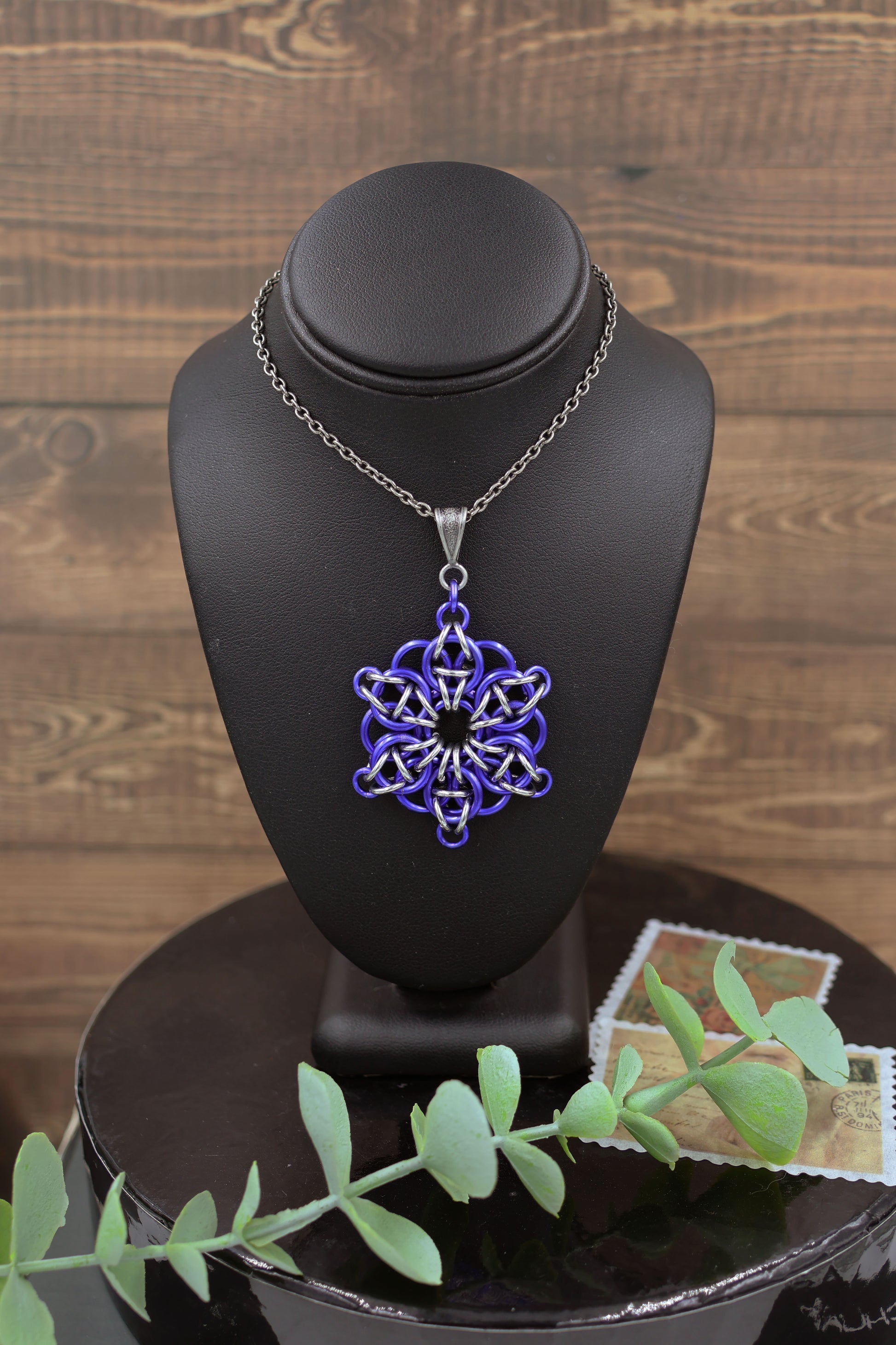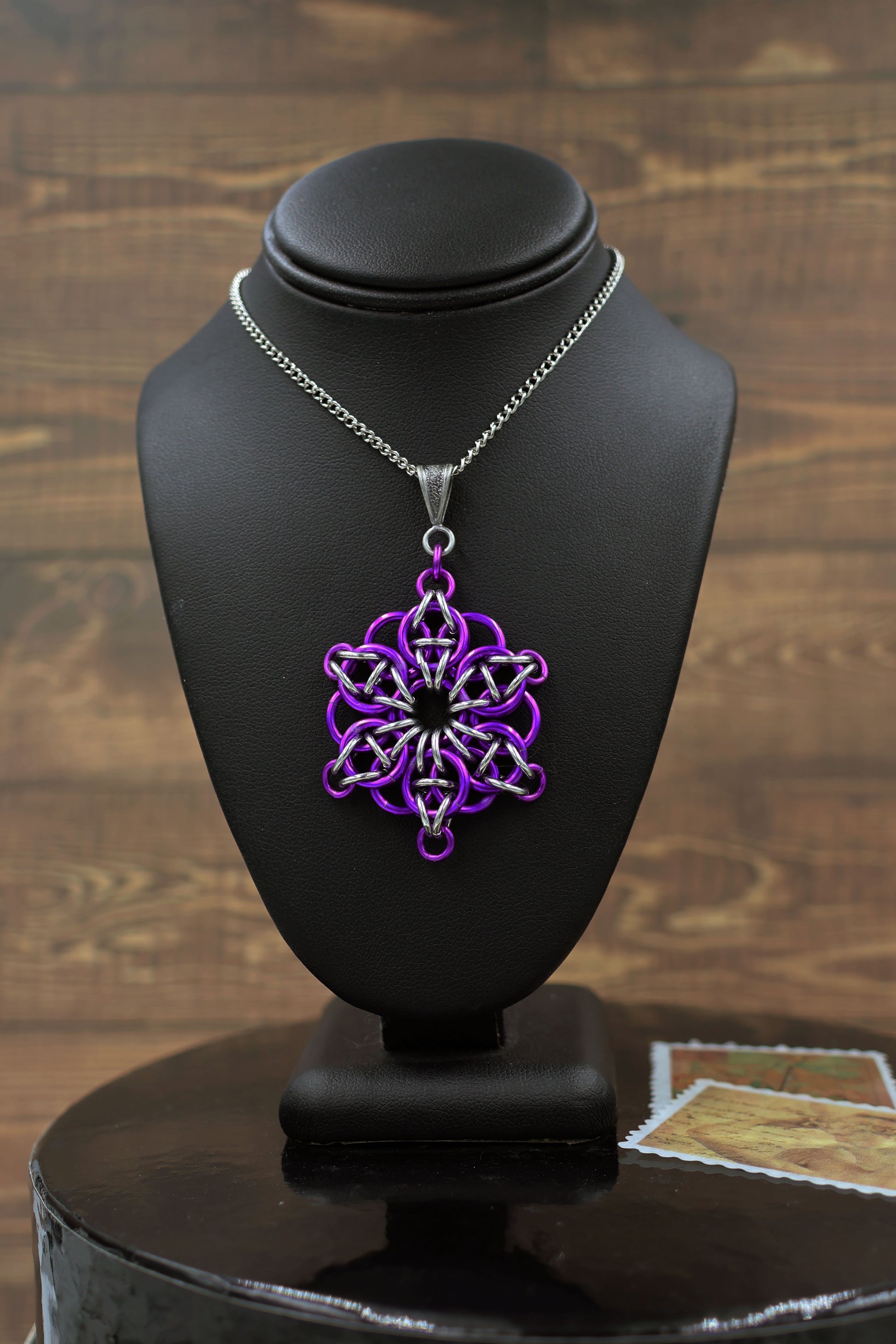 Elevate your jewelry collection with our unique and charming Celtic Visions Necklace. Handmade from lightweight anodized aluminum and available in your choice of custom colors, The Celtic Visions Necklace is a visual delight! The necklace comes with a matching lead-free pewter pendant bail and coordinating chain in your choice of length. Add our Celtic Visions Bracelet and Earrings for the perfect set!