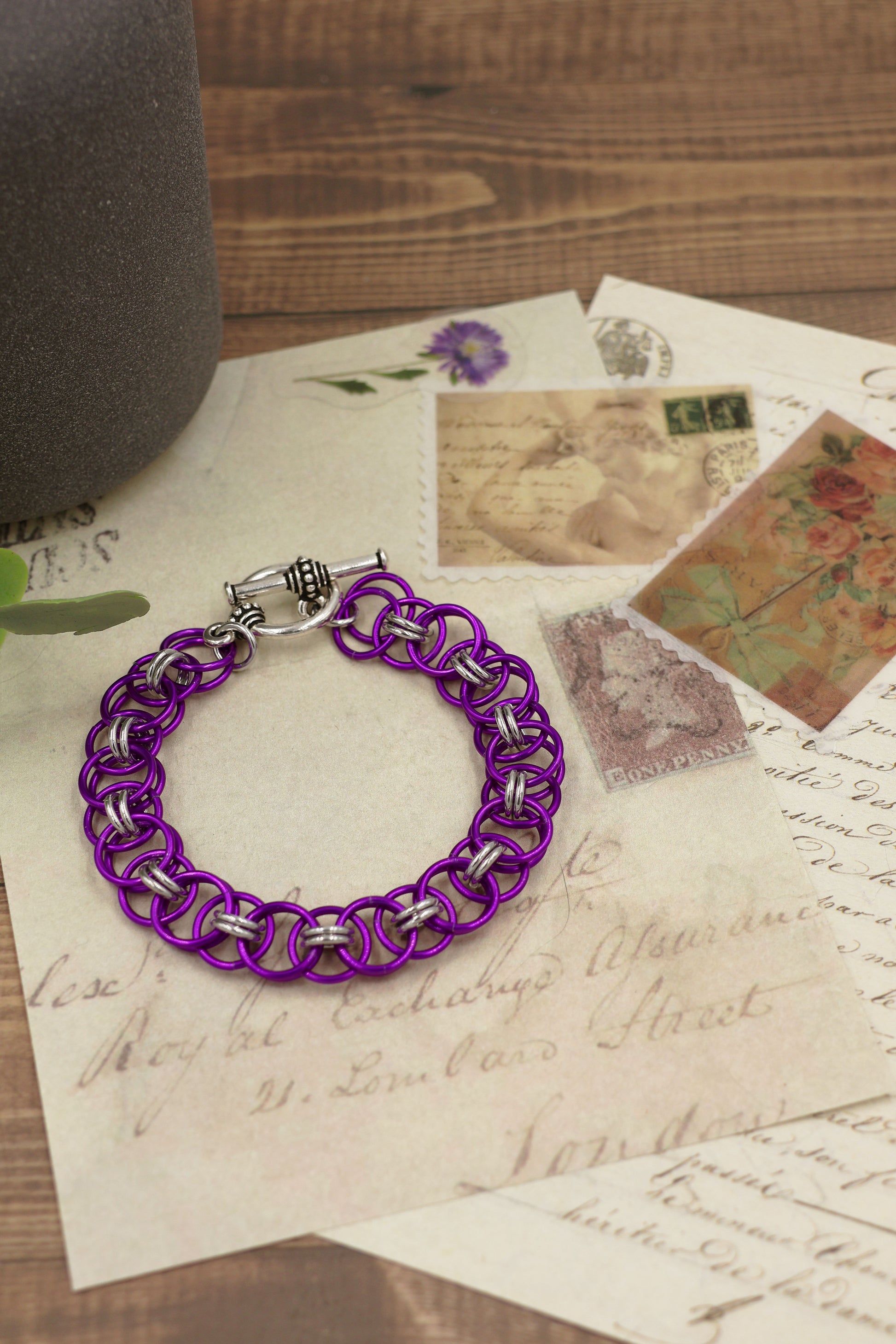 The finished bracelet has an Antique Silver toggle clasp or black lobster clasp.